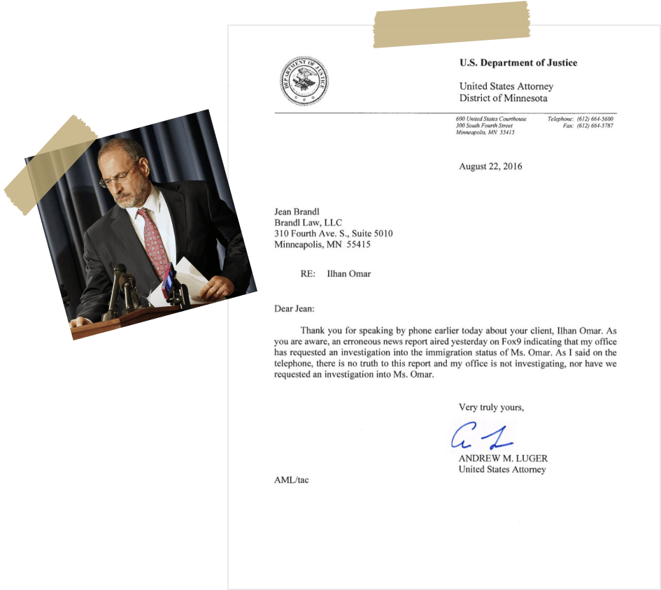 Right: Official DOJ letter issued to Rep. Omar’s private criminal attorney.
