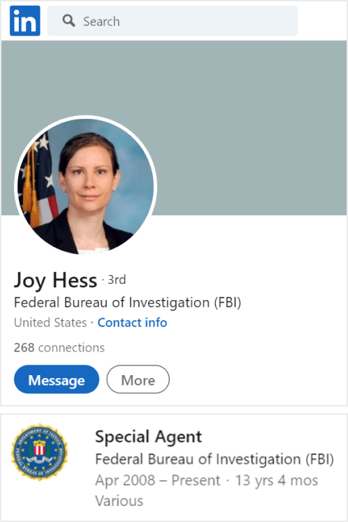 At first, she attempts to say there’s a Statute of Limitation, then claims the subject (her brother/ex-husband) has left the country, then says to contact the US Attorney’s Office. Special Agent Hess is a 13-year FBI Special Agent responsible for public corruption matters for the Twin Cities FBI Field Office, and the C3 Squad Supervisor. Her waffling excuses on this phone call are truly shocking and inexcusable to any American voter who values trust in these extremely powerful Federal agencies.
