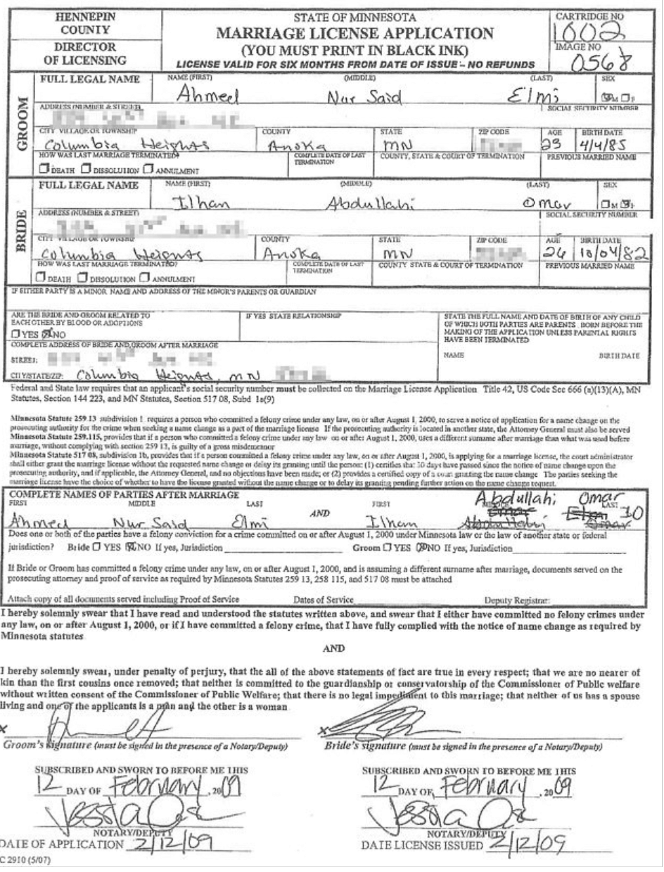 When sworn into public office in 2016, Rep. Ilhan Omar was married to an individual named Ahmed Nur Said Elmi.